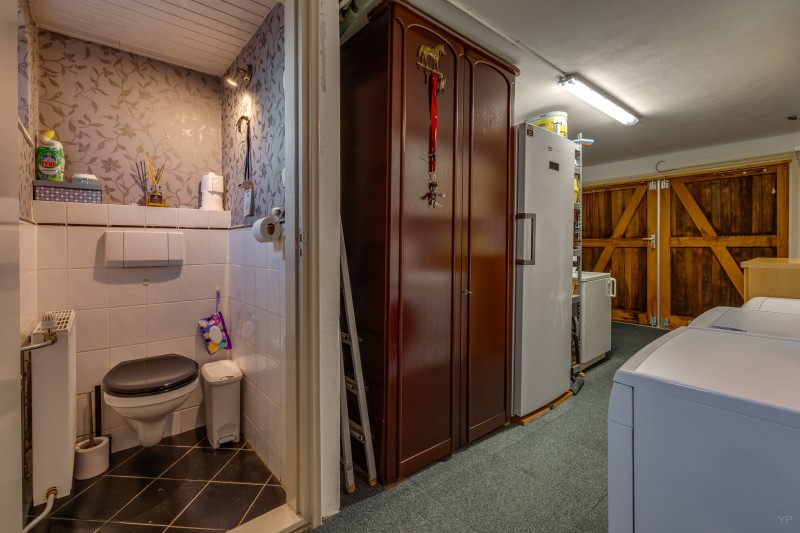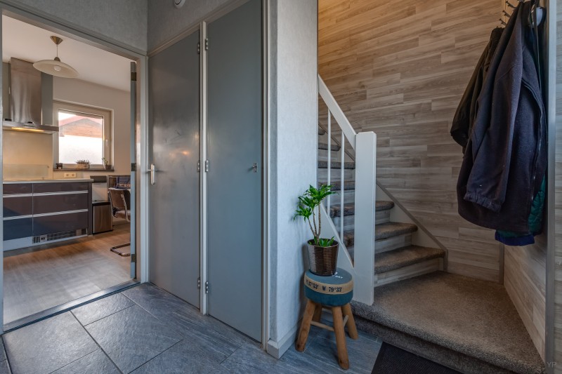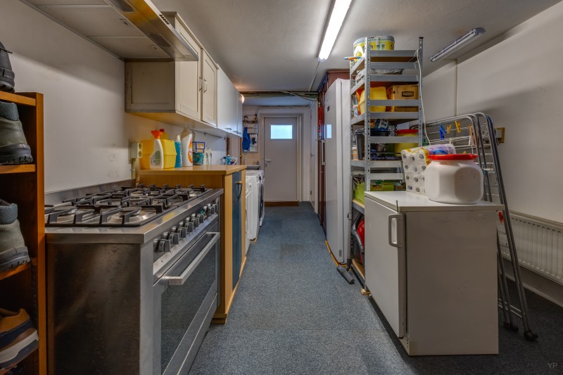 Begane grond: hal, meterkast, kelder, woonkamer met schuifpui naar de tuin, keuken met diverse inbouwapparatuur, bijkeuken, toilet.
