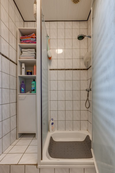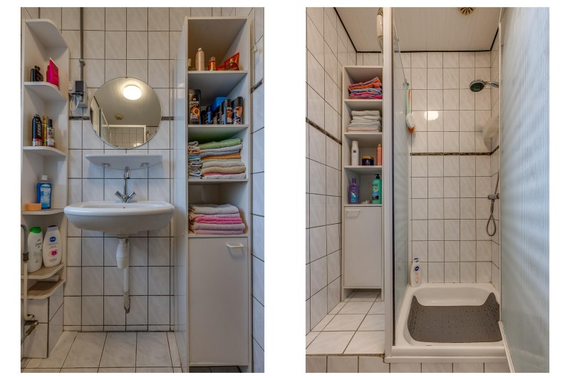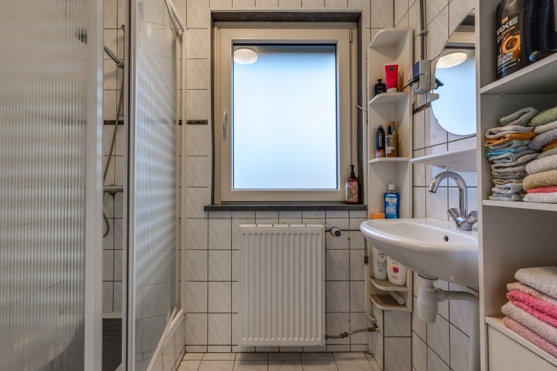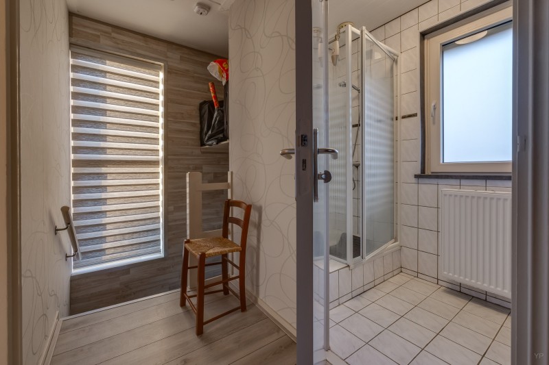 Verdieping: overloop, drie slaapkamers, badkamer voorzien van douchecabine en wastafel.