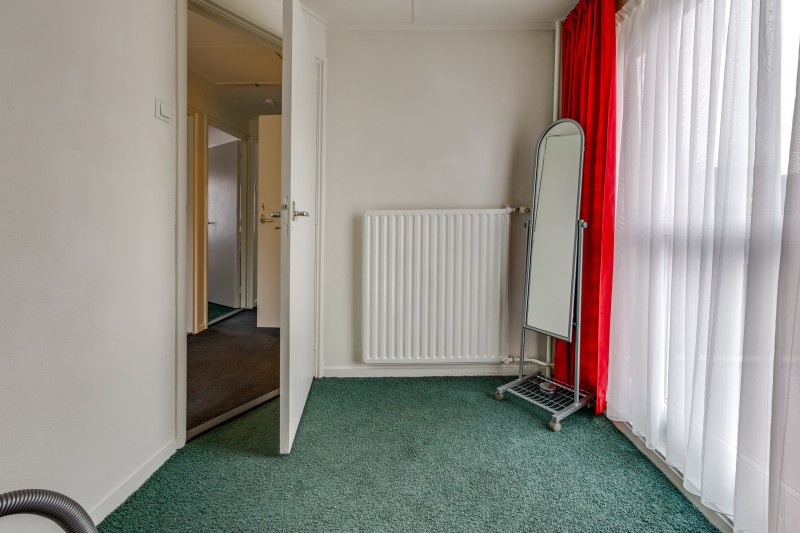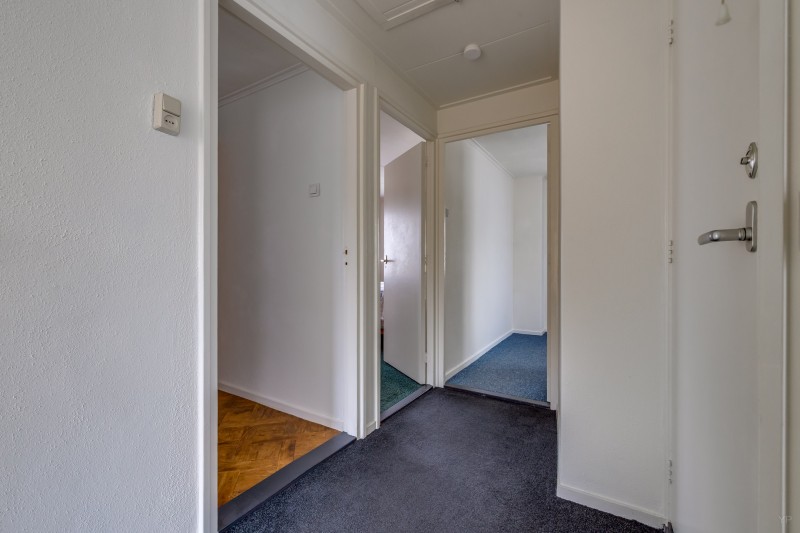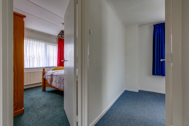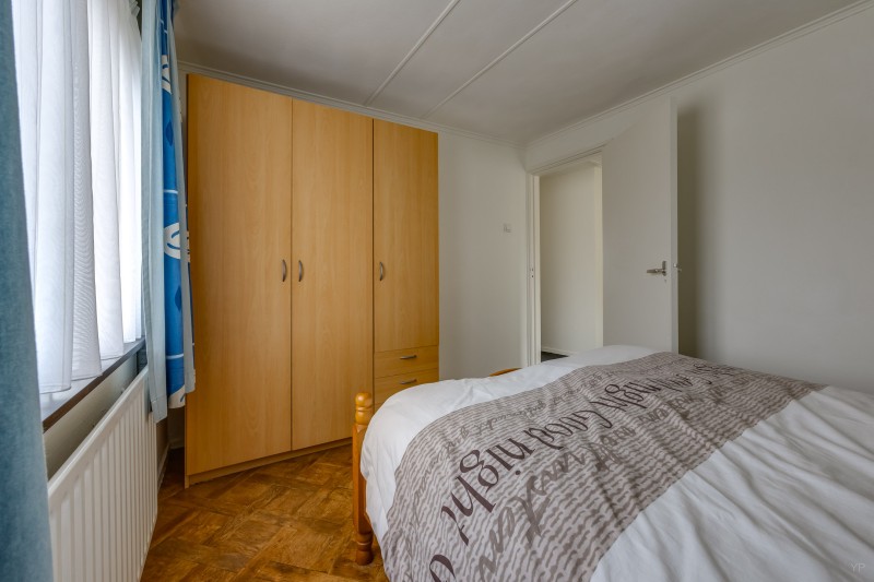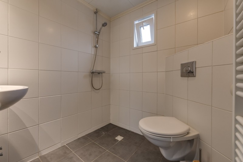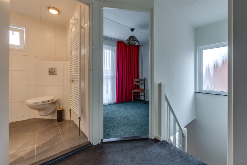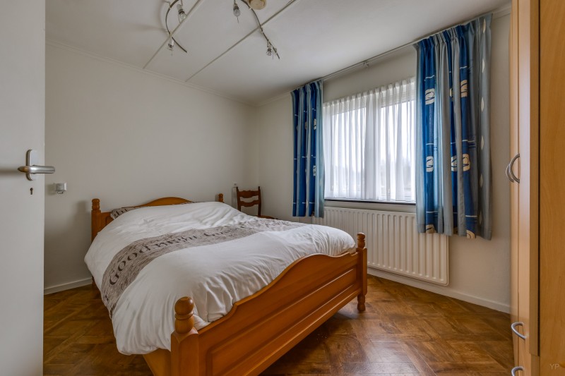 Overloop met vlizotrap naar bergzolder; 4 slaapkamers (resp. 11, 10, 9 en 5.5 m²), waarvan 1 met deur naar plat dak; badkamer met inloopdouche, toilet en wastafelmeubel.