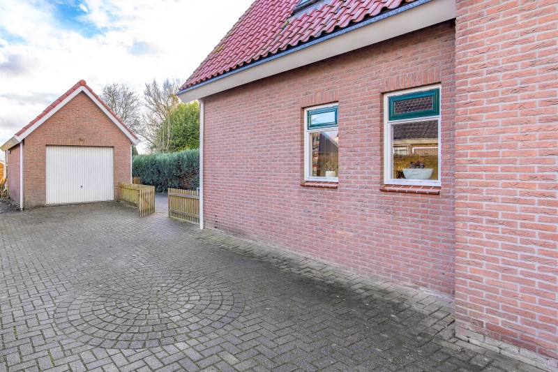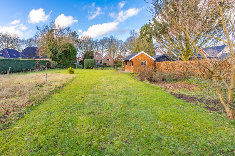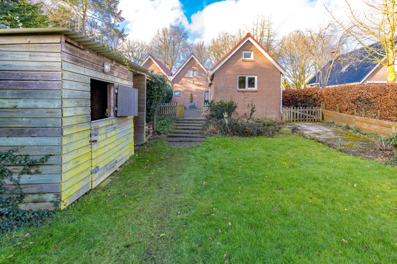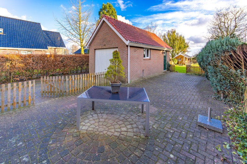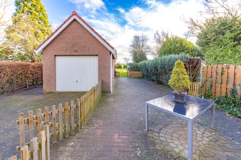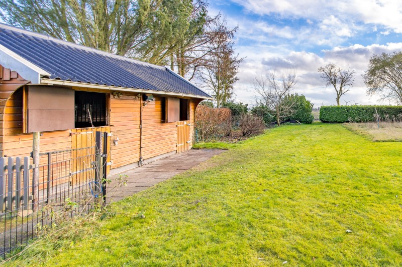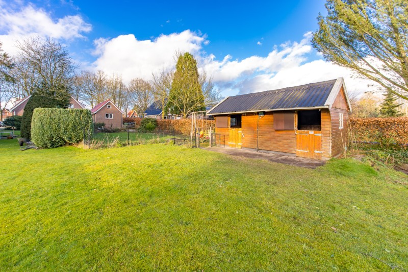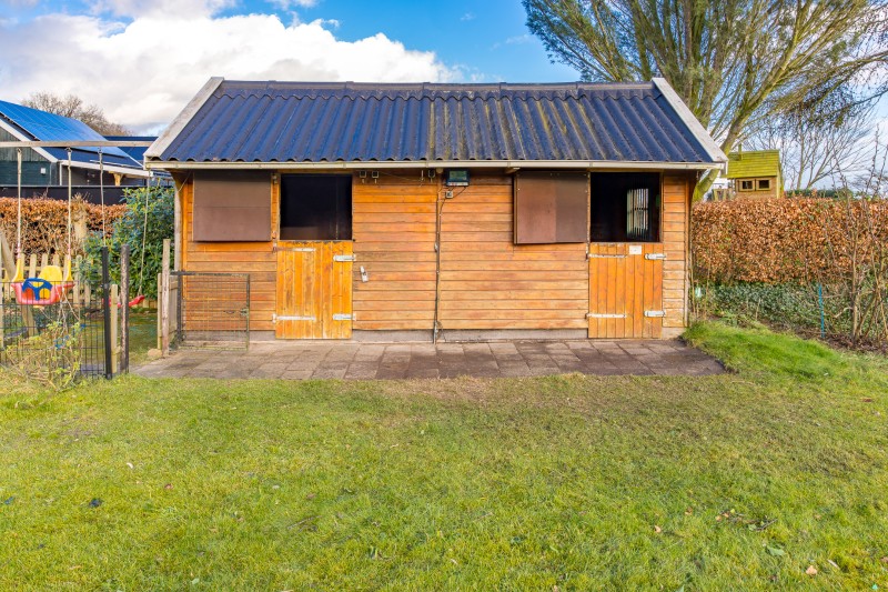 buiten ; vrijstaande stenen garage met zolder, houtenberging met overkapping, 2e houten tuinschuur met paardenboxen, water-tappunt en electra.