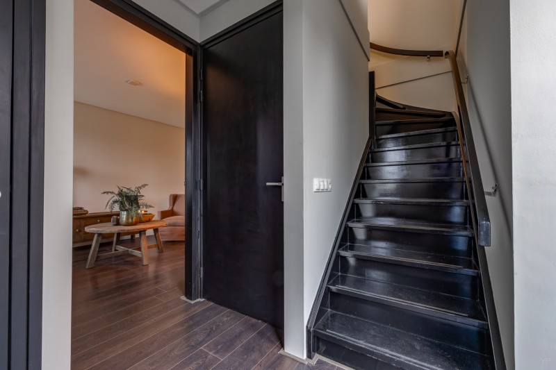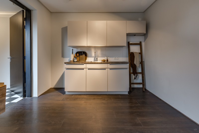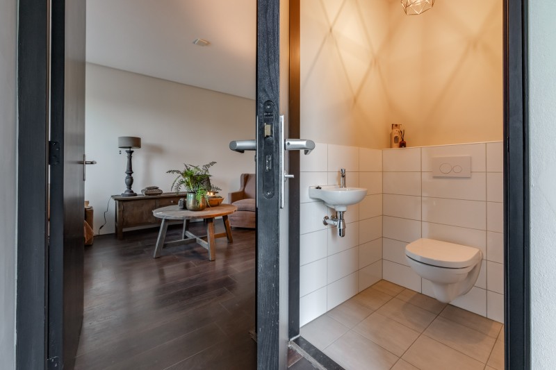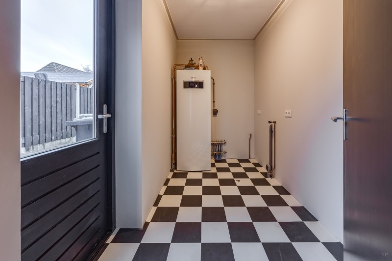 Hal/entree; meterkast; toilet met fontein; sfeervolle woonkamer met open keuken; bijkeuken met witgoedaansluitingen, warmtepomp en achter-entree.