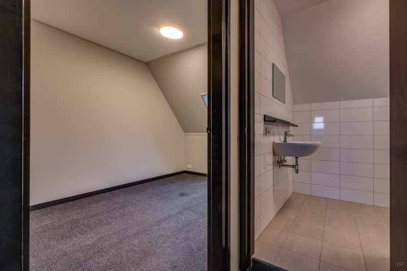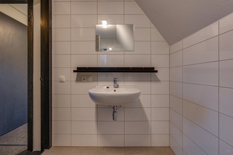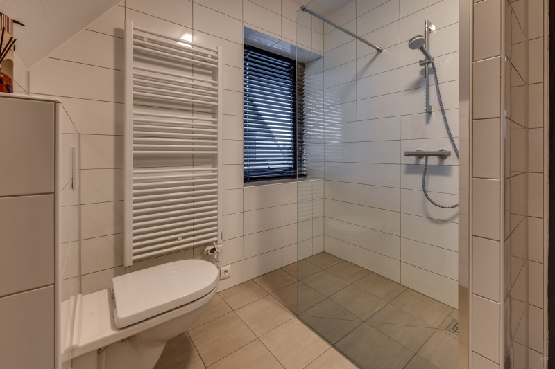 Overloop; 2 slaapkamers; badkamer voorzien van inloopdouche, toilet en vaste wastafel.