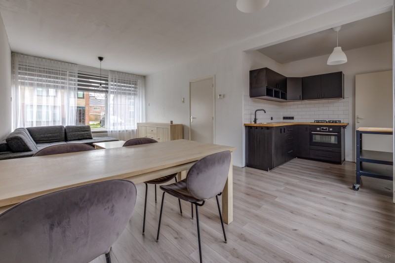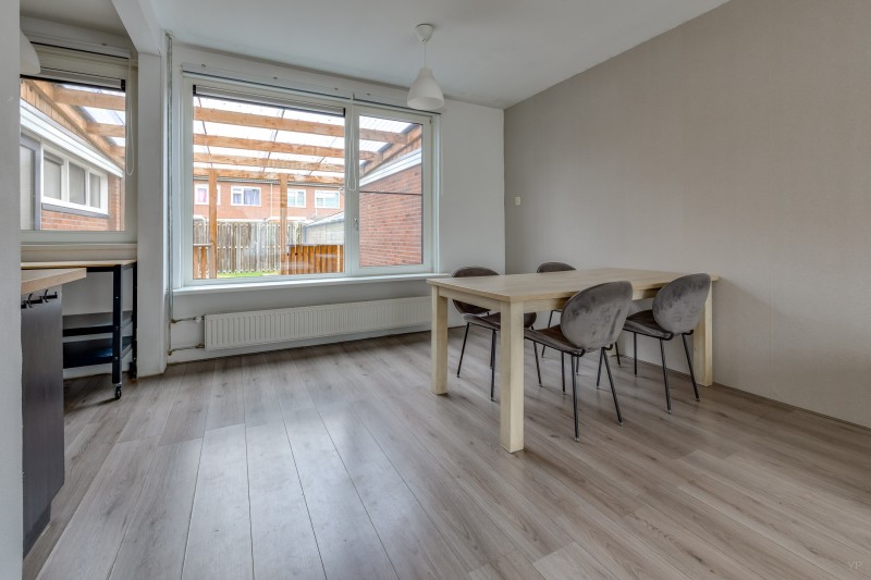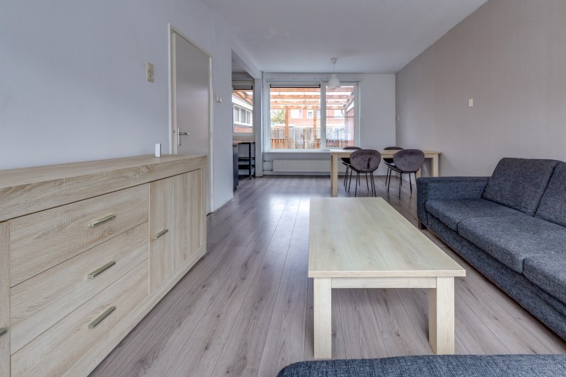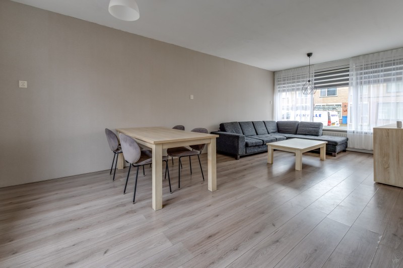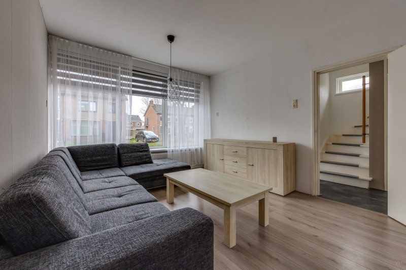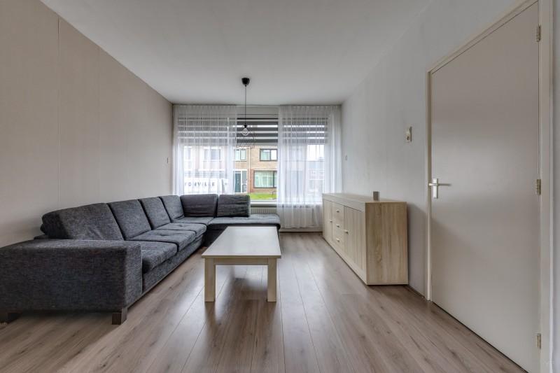 De lichte woonkamer is afgewerkt met een nette laminaatvloer en biedt een prettige leefruimte.