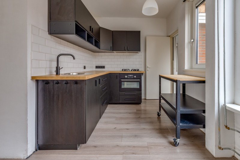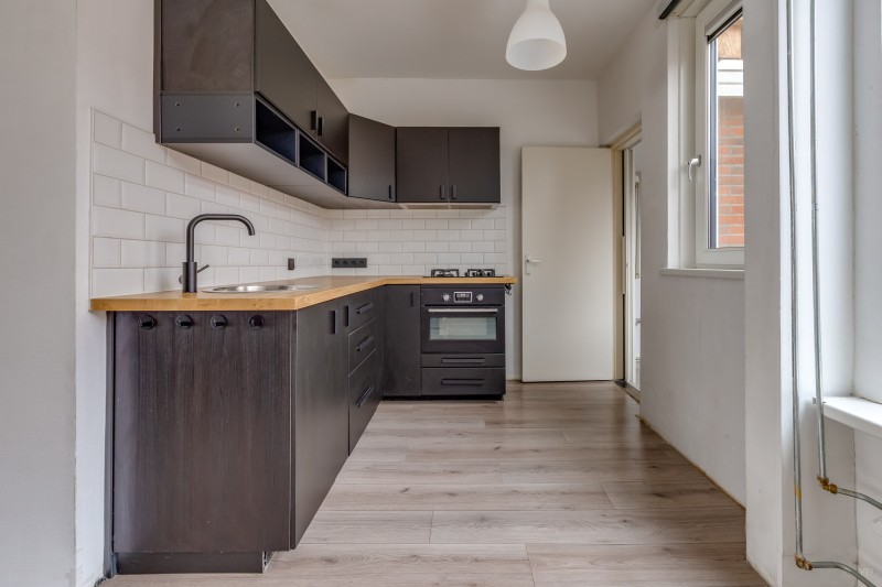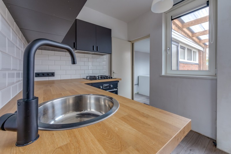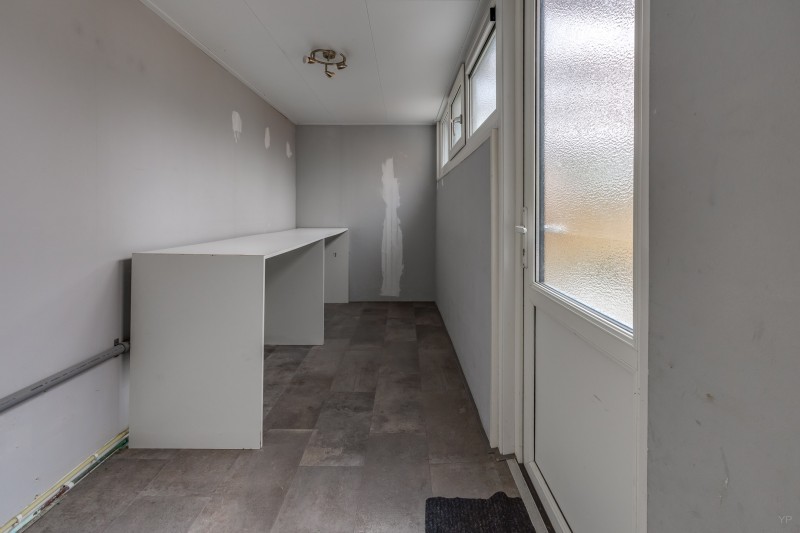 Aansluitend vind je de handige bijkeuken met aansluitingen voor wasmachine en droger en toegang tot de achtertuin.