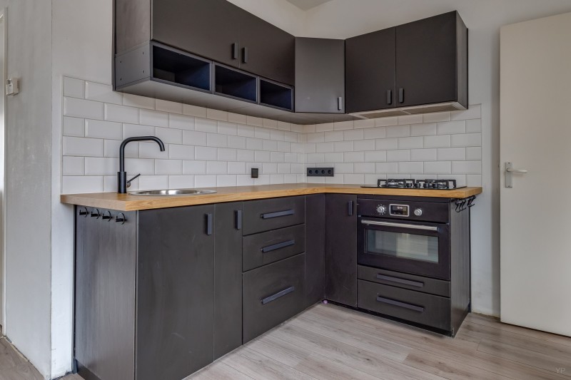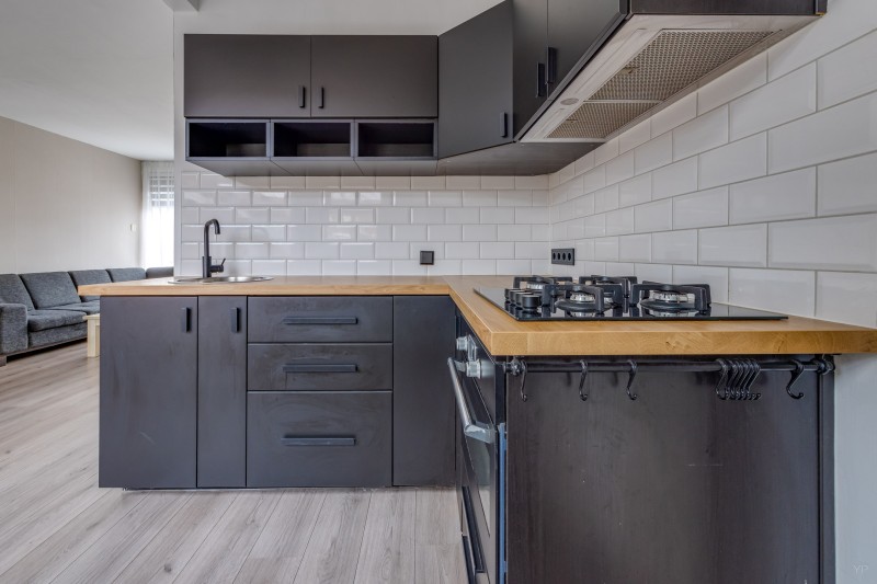 De half-open keuken beschikt over een 4-pits gas-op-glas kookplaat, afzuigkap en combimagnetronoven.