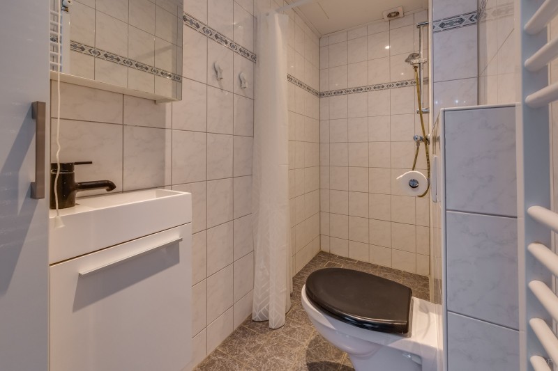 De badkamer is functioneel ingericht met een douche, toilet en wastafelmeubel.