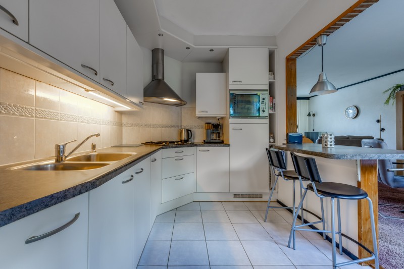 Begane grond: hal, meterkast, toilet, trapkast, doorzonwoonkamer, keuken voorzien van combimagnetron, koelkast, diepvries, gaskookplaat en afzuigkap, bijkeuken met binnendoor naar de garage .