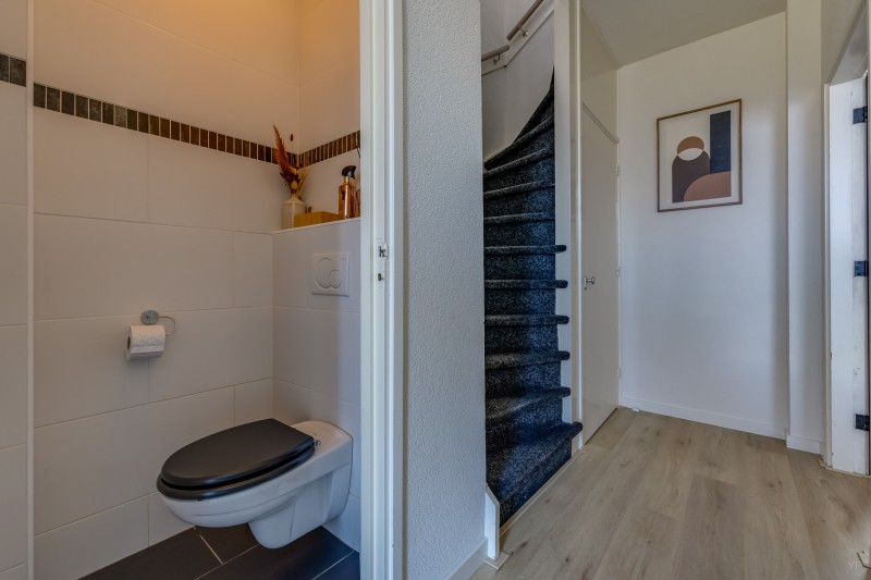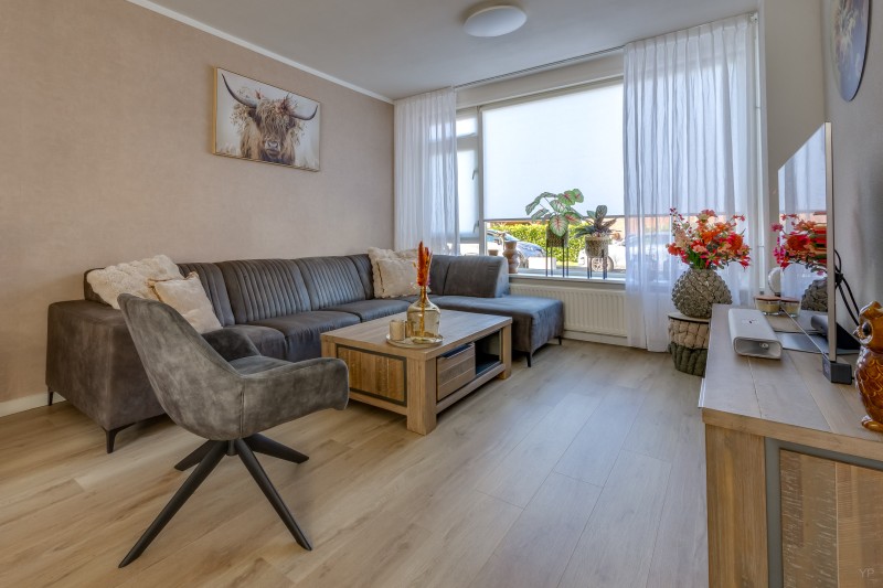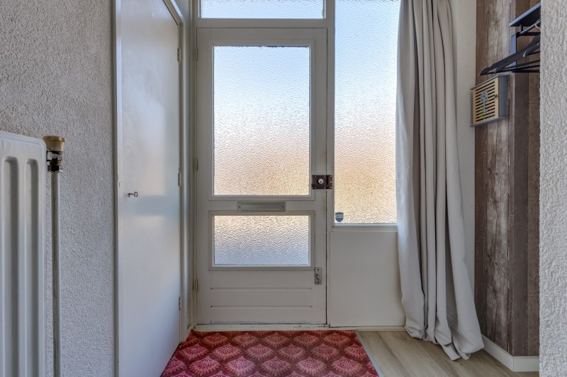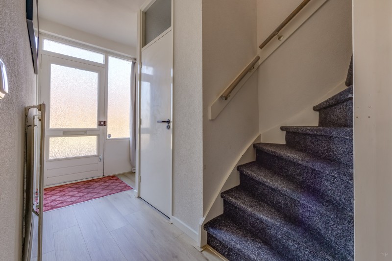Via de entree komt u binnen in de hal met meterkast, trapopgang en toegang tot het toilet. Vanuit de hal bereikt u de ruime woonkamer. De woonkamer heeft grote raampartijen waardoor er veel natuurlijk licht binnenvalt, wat zorgt voor een aangename en lichte leefruimte.