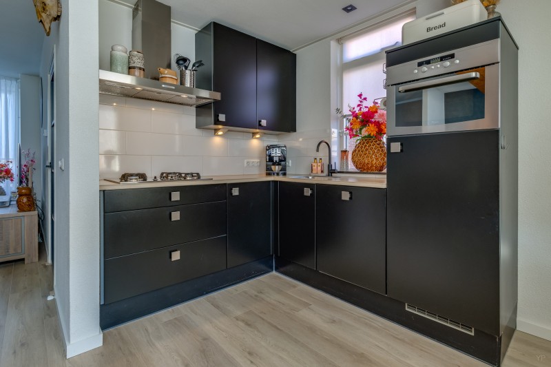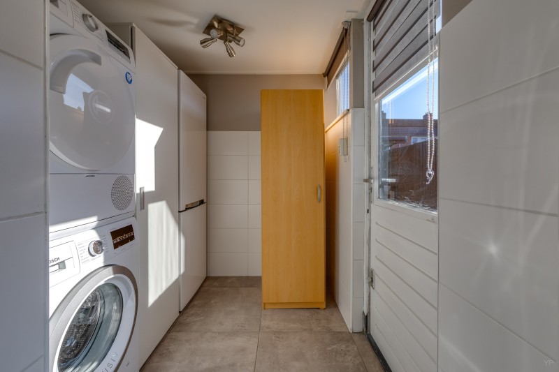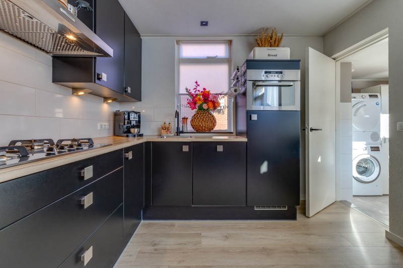 Aan de achterzijde van de woning bevindt zich de keuken. De keuken is praktisch ingericht en beschikt over een kelderkast die extra bergruimte biedt. Vanuit de keuken is er toegang tot de bijkeuken. In de bijkeuken bevinden zich onder andere de aansluitingen voor de wasmachine en extra opbergruimte.