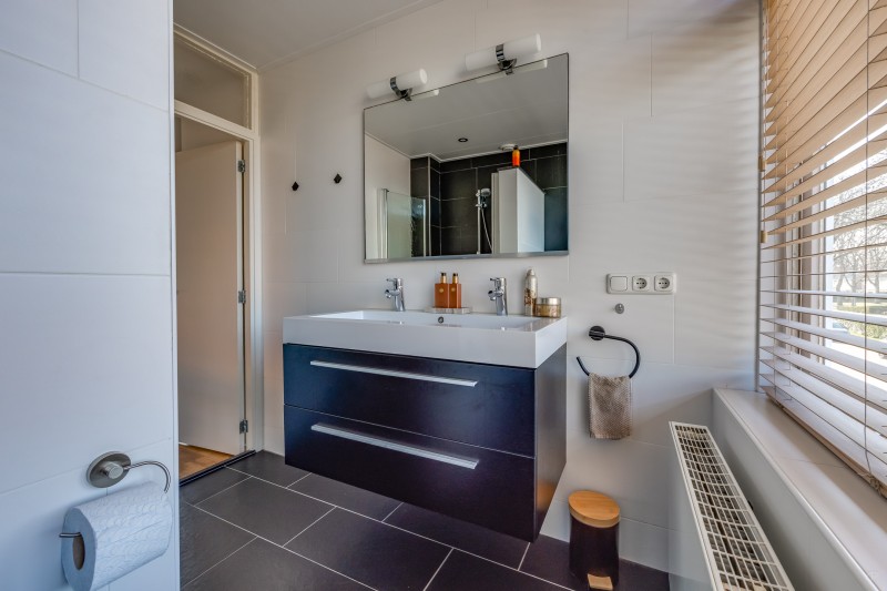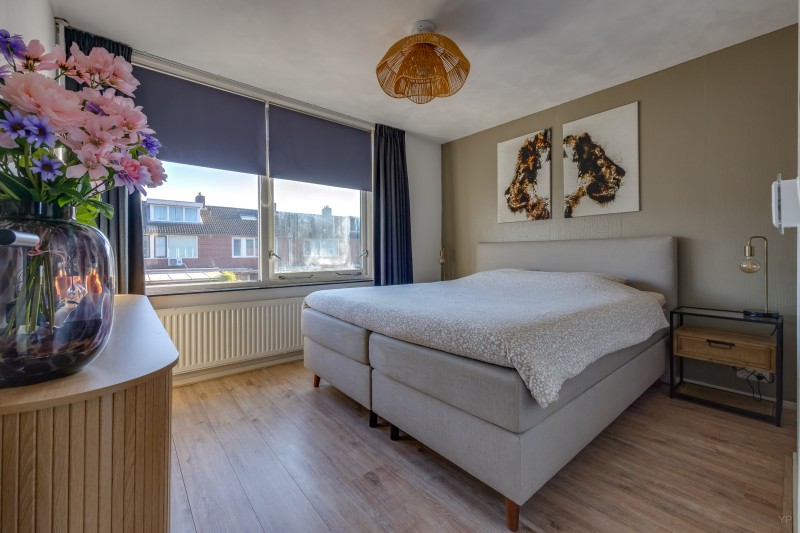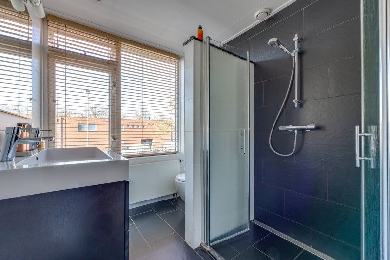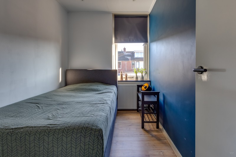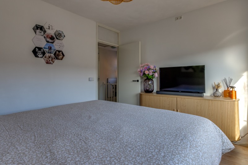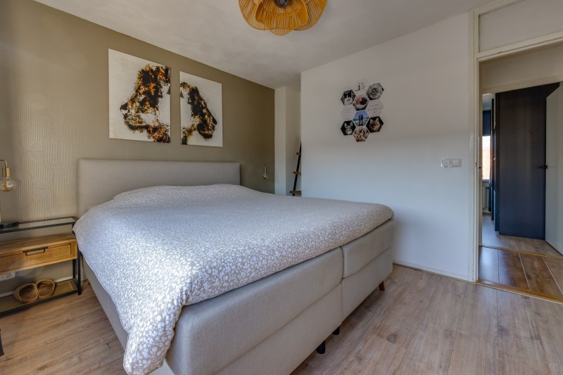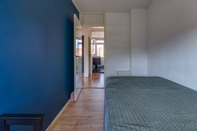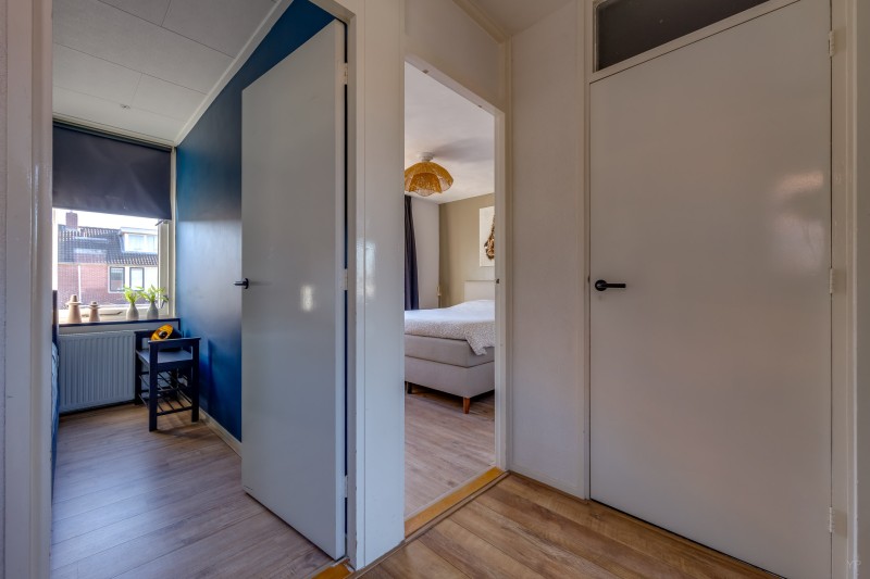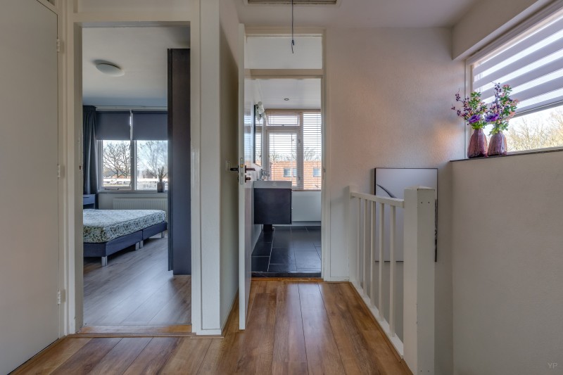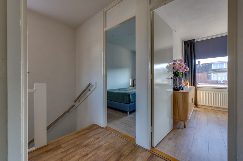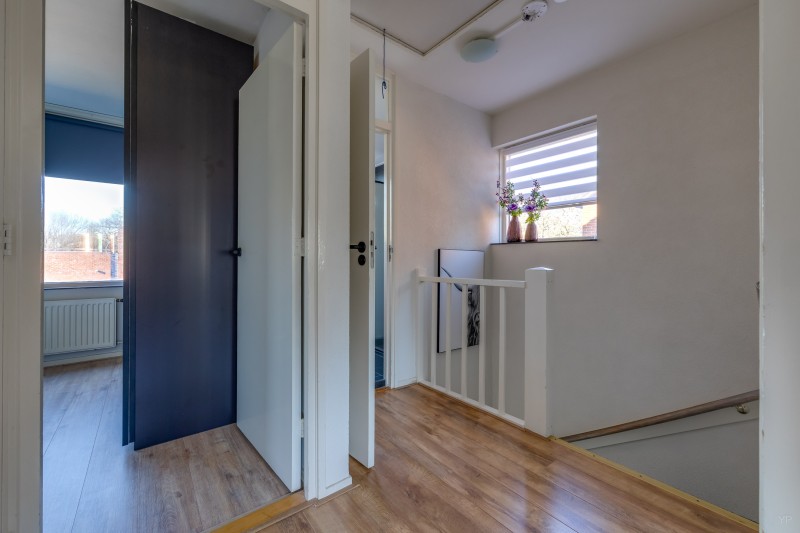 Op de eerste verdieping bevindt zich de overloop met toegang tot drie slaapkamers en de badkamer. Twee slaapkamers liggen aan de achterzijde van de woning en één slaapkamer aan de voorzijde. De kamers zijn praktisch van formaat en geschikt als slaap-, werk- of hobbykamer.