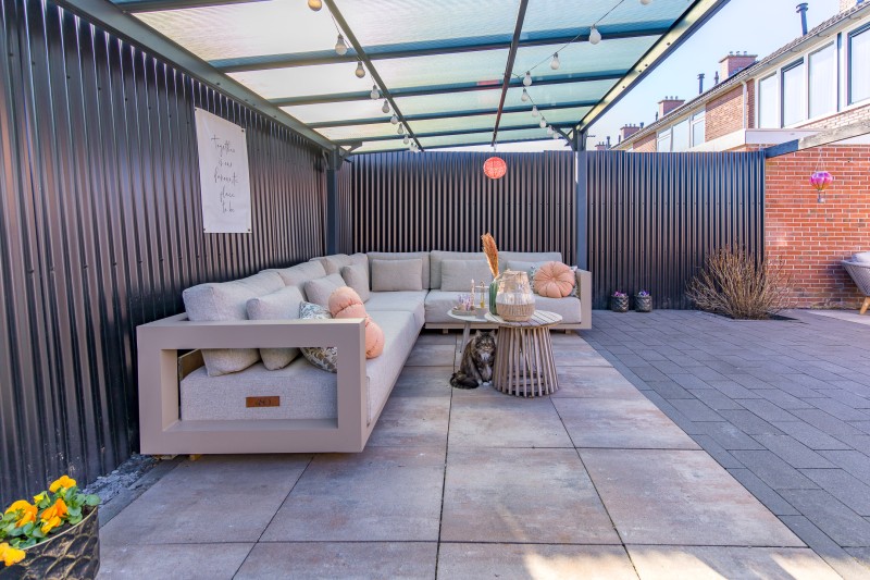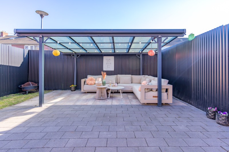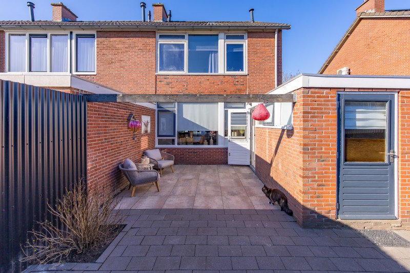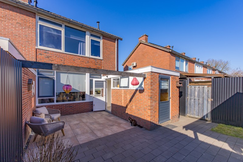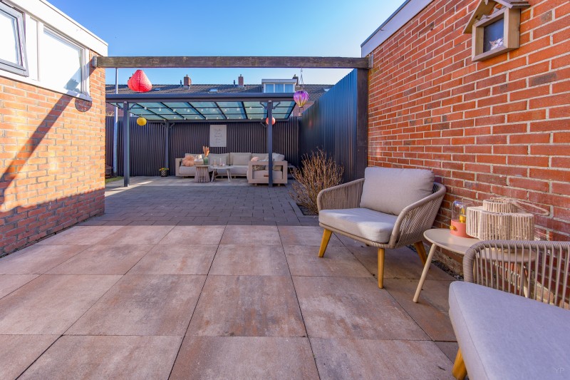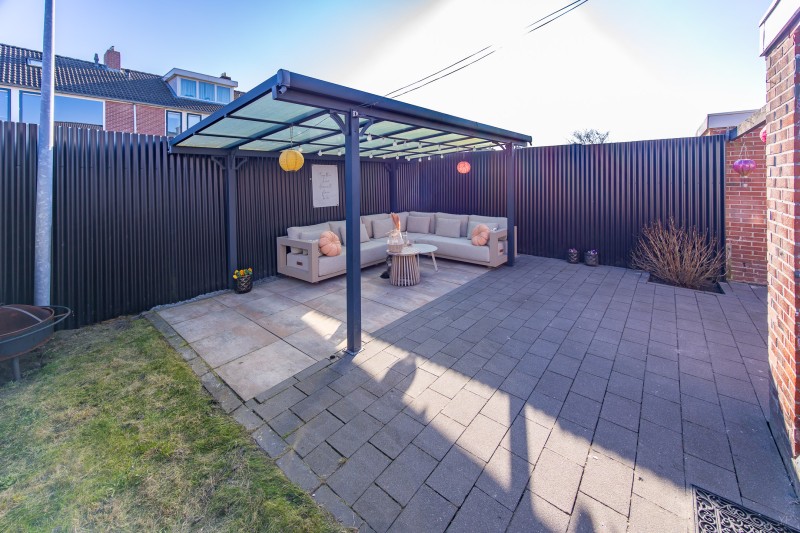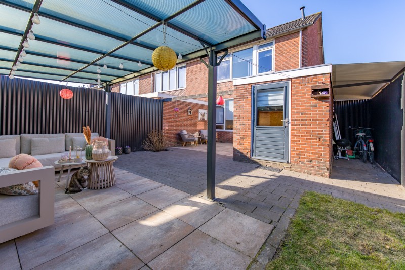 Via de bijkeuken bereikt u de achtertuin. Hier bevindt zich een overkapping en een vrijstaande berging, ideaal voor het stallen van fietsen, tuingereedschap of andere opslag.