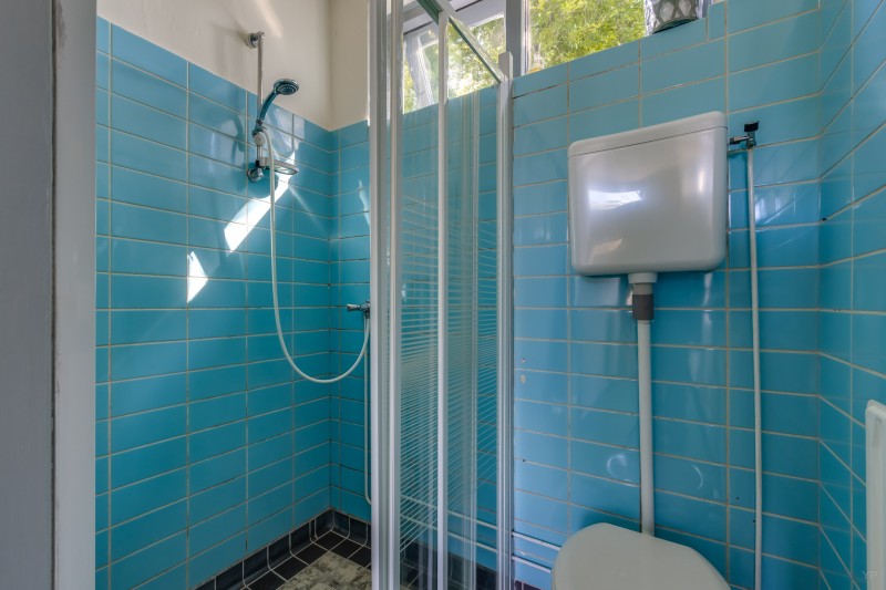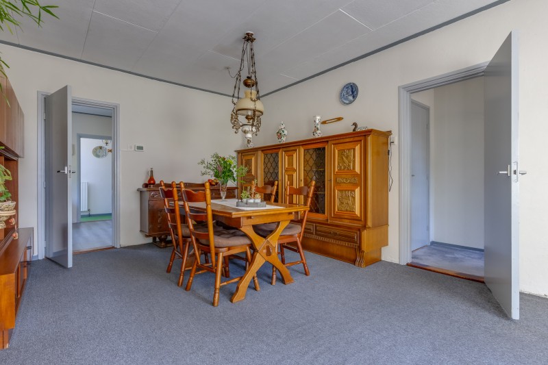 Linker gedeelte: Eetkamer, gesloten keuken met eenvoudig keukenblok, achterentree met bergruimte en opstelplaats voor de CV-ketel (HR, 2023), eenvoudige douche met toilet, Slaapkamer 2