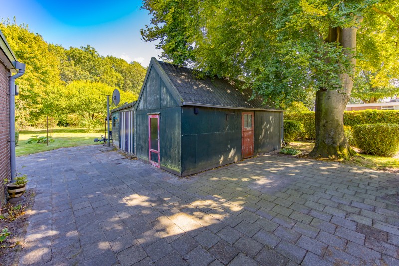 Vrijstaande houten garage met aangebouwde schuur