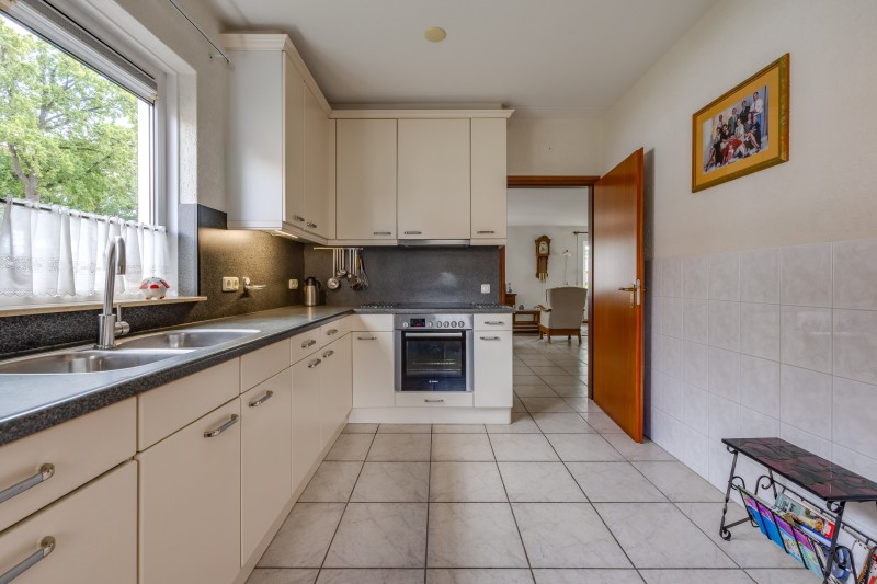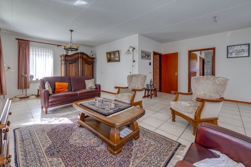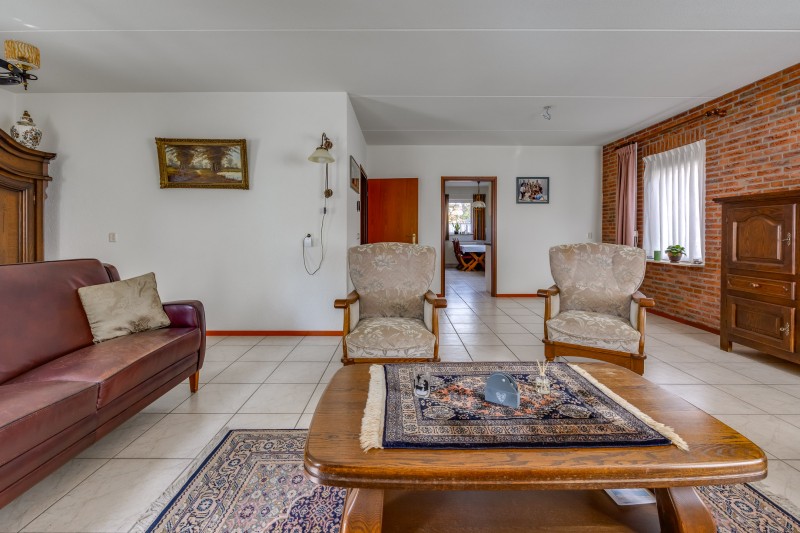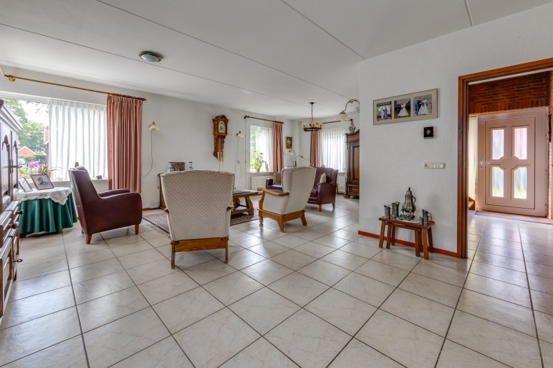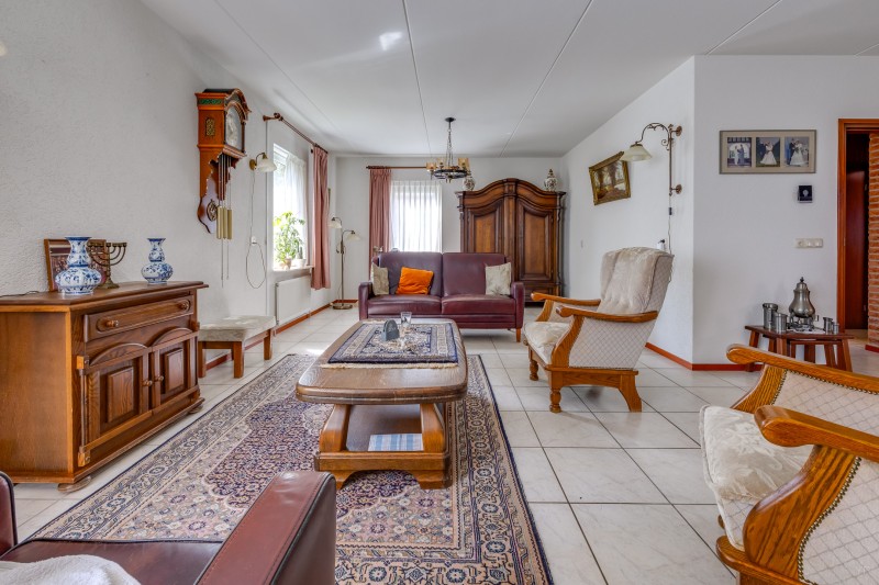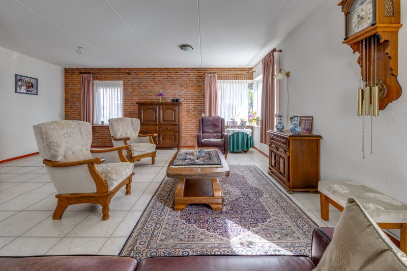 Het woonhuis is in de jaren '90 traditioneel gebouwd met degelijke materialen, aan de achterzijde uitgebouwd met een royale bijkeuken en stenen garage. Tevens is de woning voorzien van een slaap- en badkamer op de begane grond en 4 slaapkamers op de 1e verdieping. De woonkamer is verrassend ruim en heeft een mooi uitzicht.