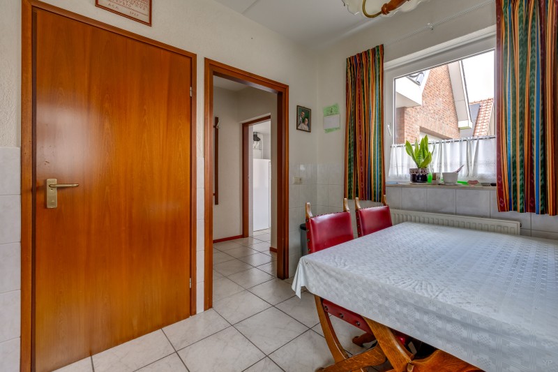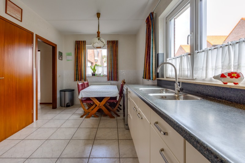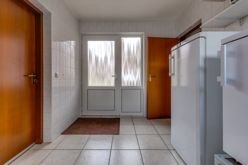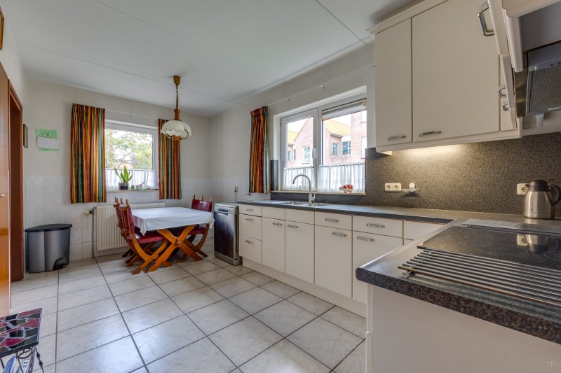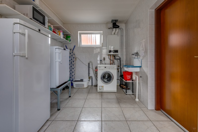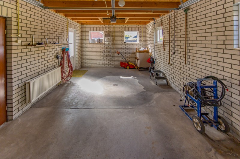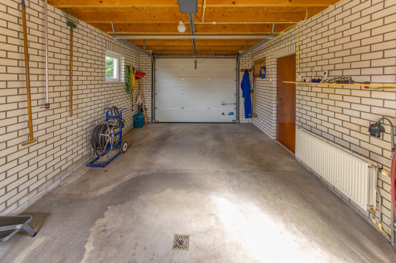 Hal/entree met meterkast en toilet; toegang tot slaapkamer en badkamer; royale woonkamer; woonkeuken met aanbouwkeuken voorzien van div. inbouwapparatuur; tussenhal; ruime bijkeuken met achter-entree, aansl. voor wasm. en droger; toegang tot aangebouwde garage met loopdeur, elek. sectionaaldeur en zolderruimte.