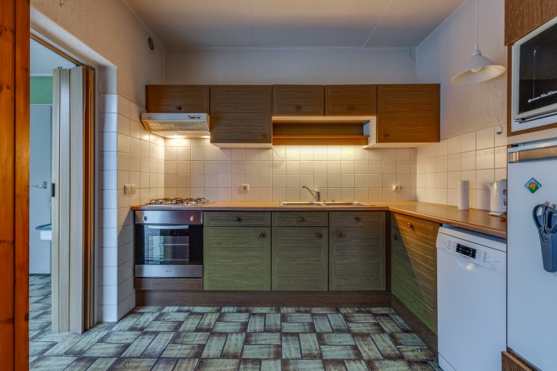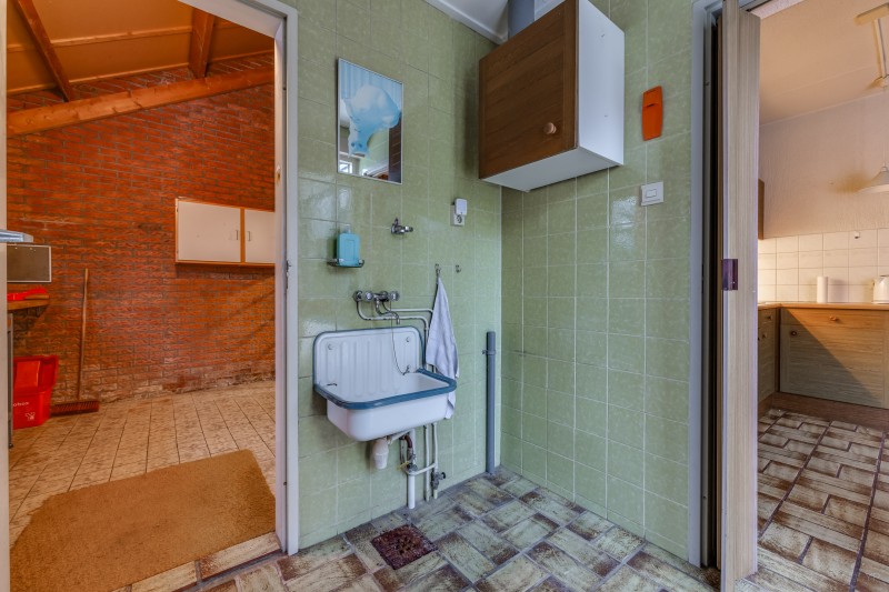 Hal/entree met meterkast; toilet; sfeervolle Z-vormige woonkamer; half open keuken met eenvoudige aanbouwkeuken; bijkeuken met inloopkast, achter-entree en toegang tot aangebouwde stenen schuur met voor-entree en open zolder.