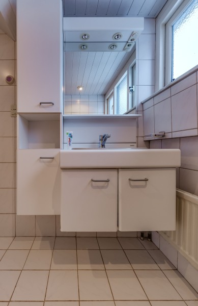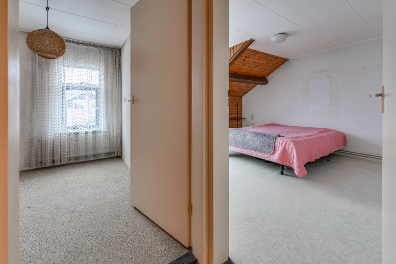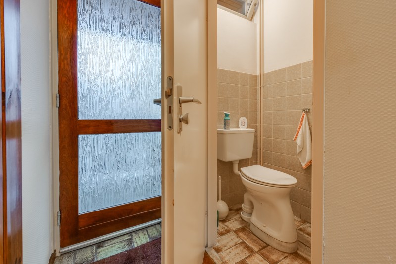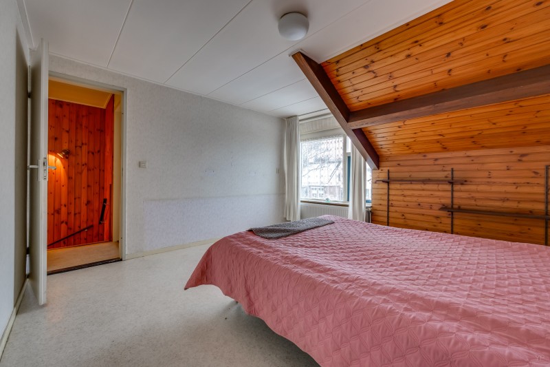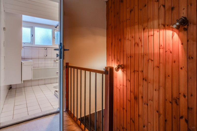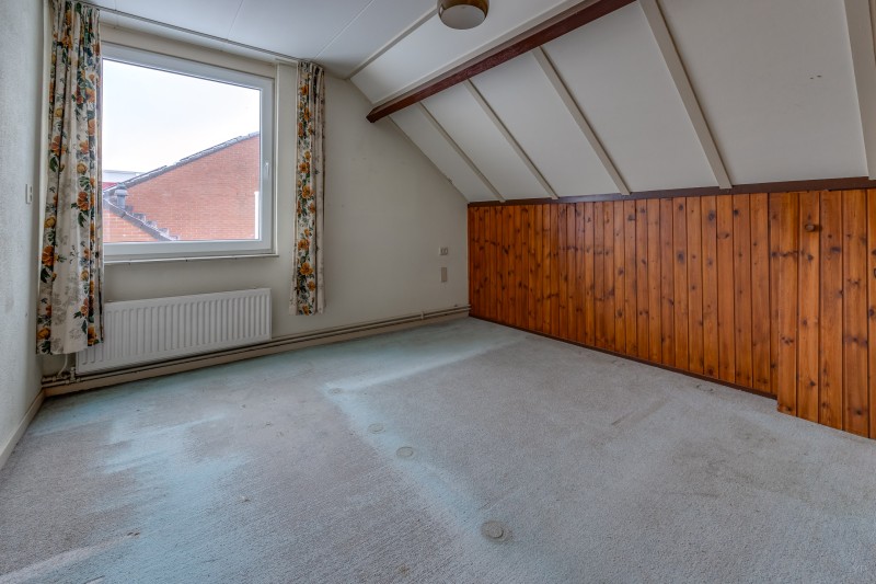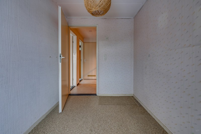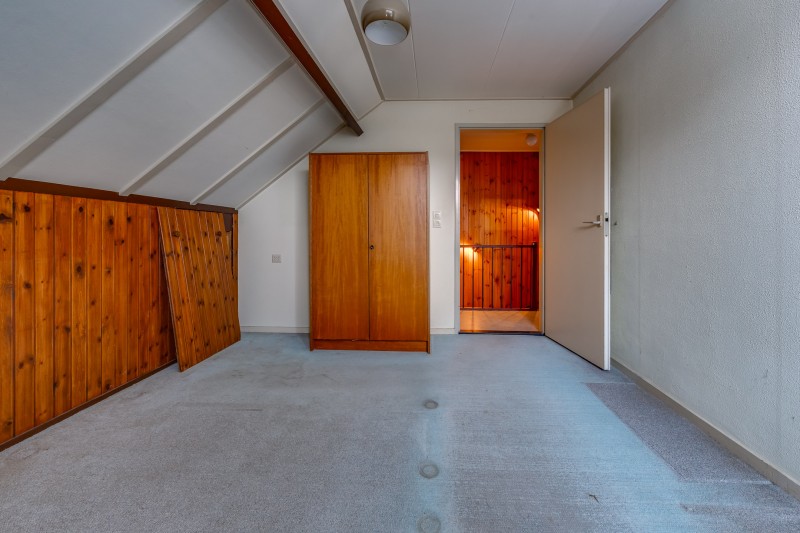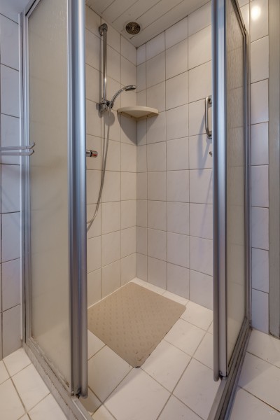Overloop; 3 slaapkamers (resp. 13, 12 en 5.5 m²) waarvan 1 voorzien van extra bergruimte; badkamer voorzien van douchehoek, toilet en wastafelmeubel.