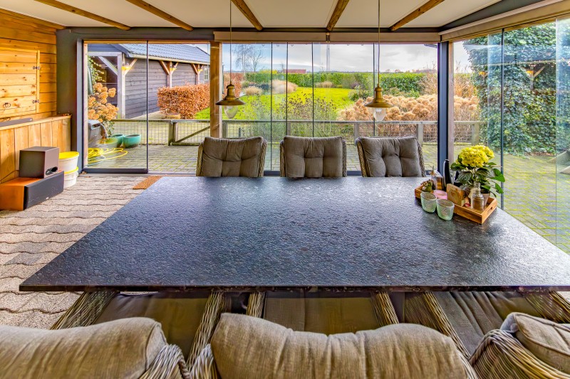 * aangebouwde houten serre met glazen schuifwanden en houtkachel