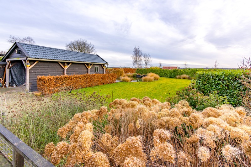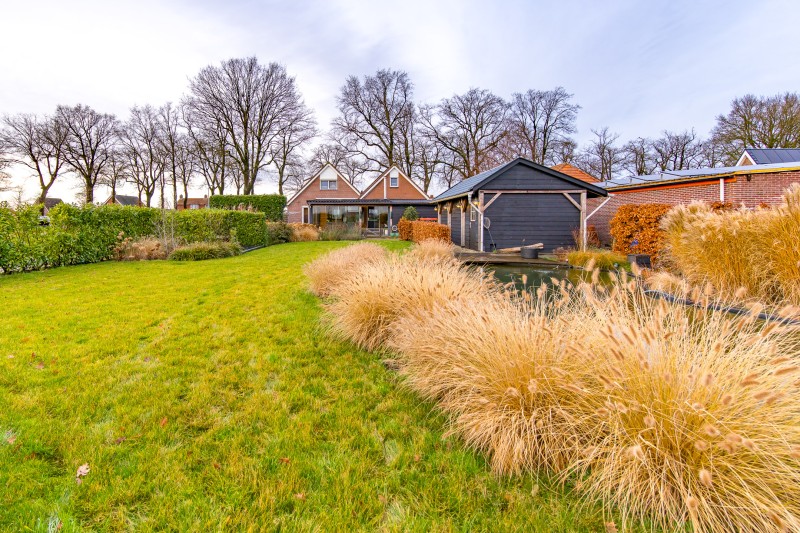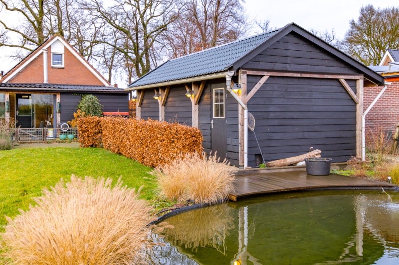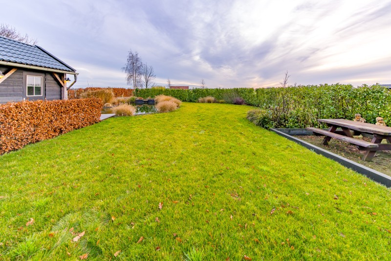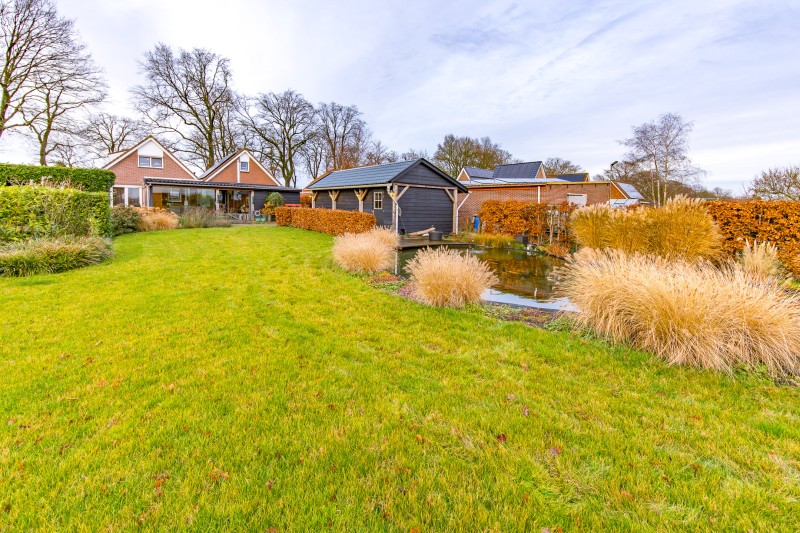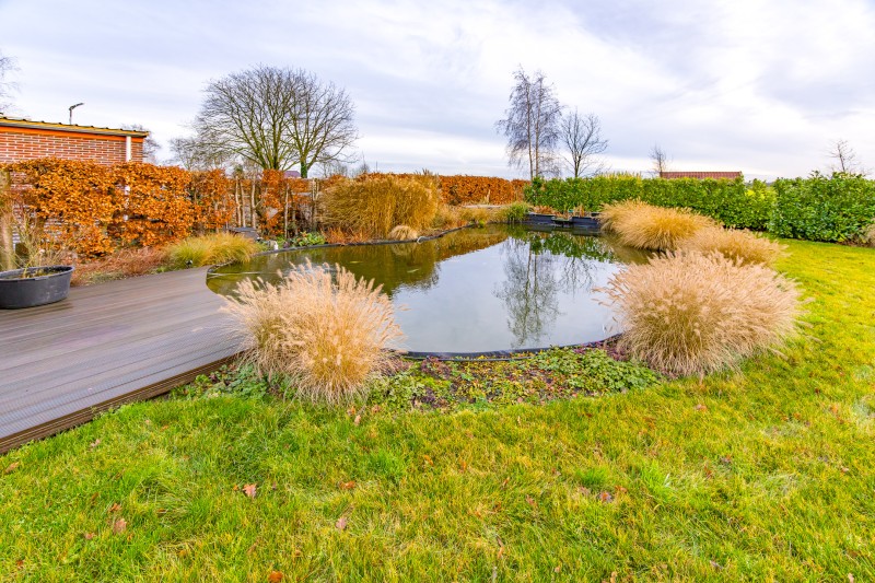 * prachtige aangelegde vijverpartij met daarachter ruimte voor eventueel kleinvee