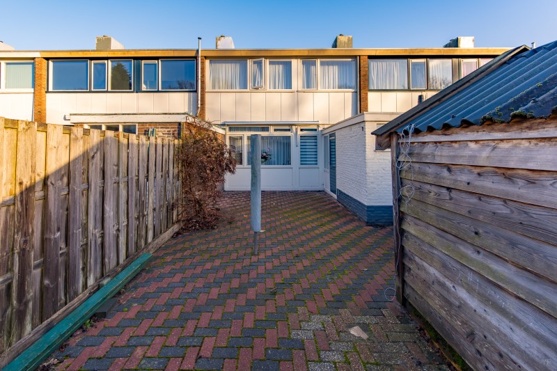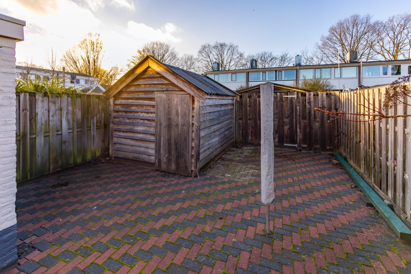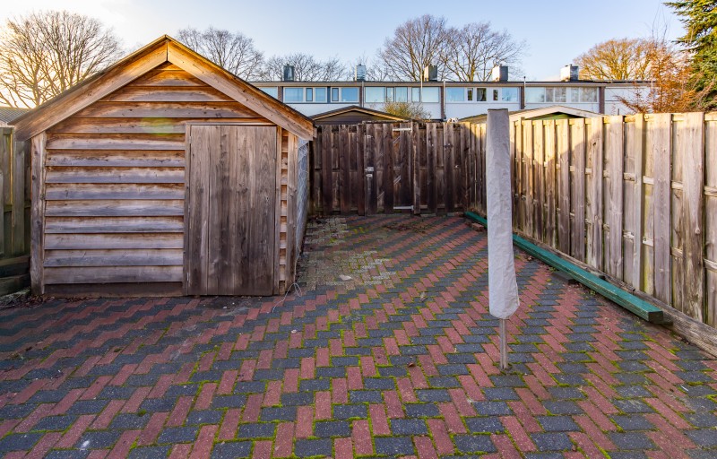 buiten; onderhoudsarme achtertuin met houten tuinhuis en achterom. Nette aangelegde voortuin.