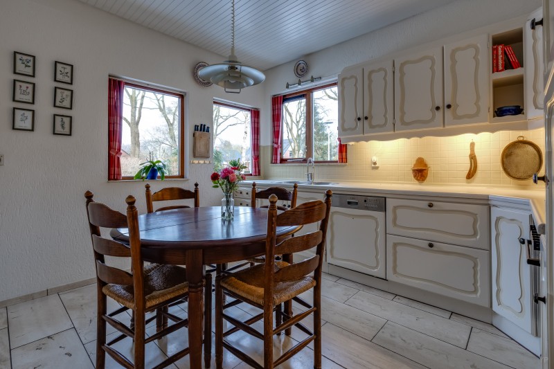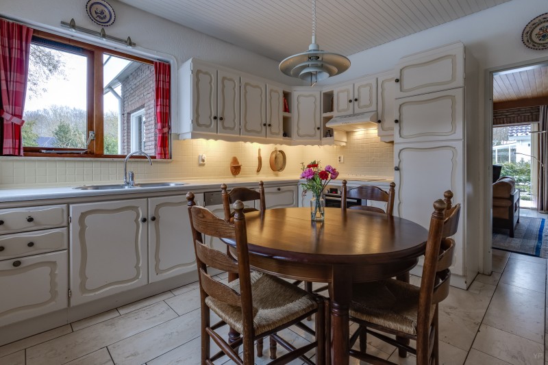De woonkeuken is uitgevoerd in een hoekopstelling voorzien van praktische inbouwapparatuur en vaste kast, een fijne plek voor wie graag kookt en samenkomt.