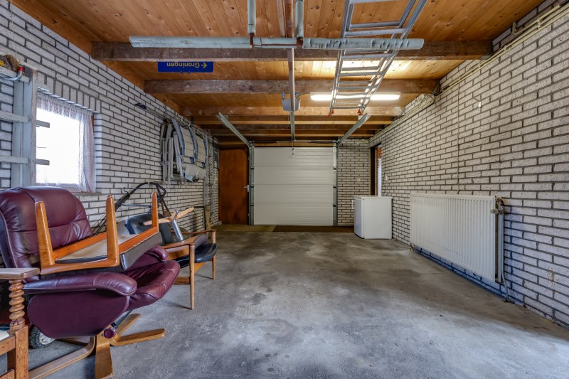 Via de hal bereikt u de aangebouwde garage, uitgerust met elektra, witgoedaansluitingen, een elektrische sectionaaldeur, voor- en achter-entree én extra bergruimte op de royale zolder waar u rechtop kunt staan, bereikbaar via een vlizotrap. Buitenom is de separate cv-ruimte toegankelijk, waar tevens het sproeisysteem is ondergebracht.