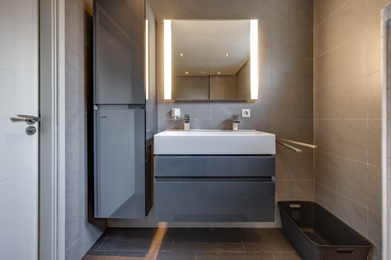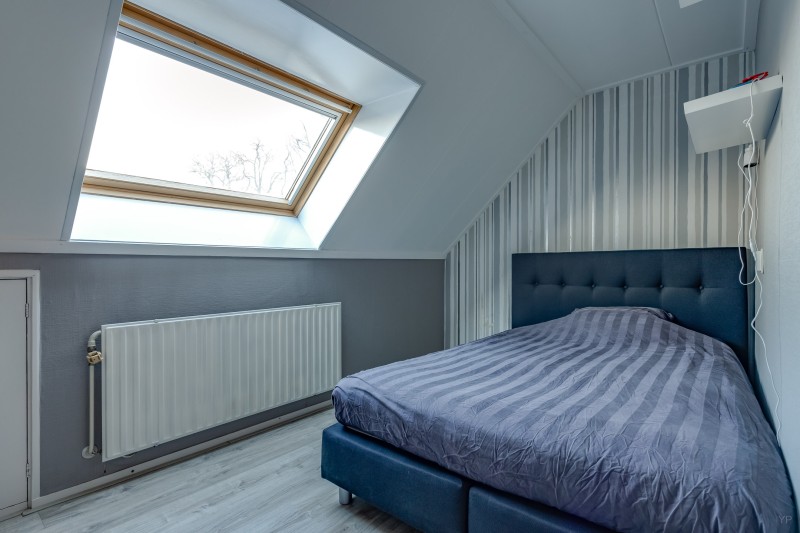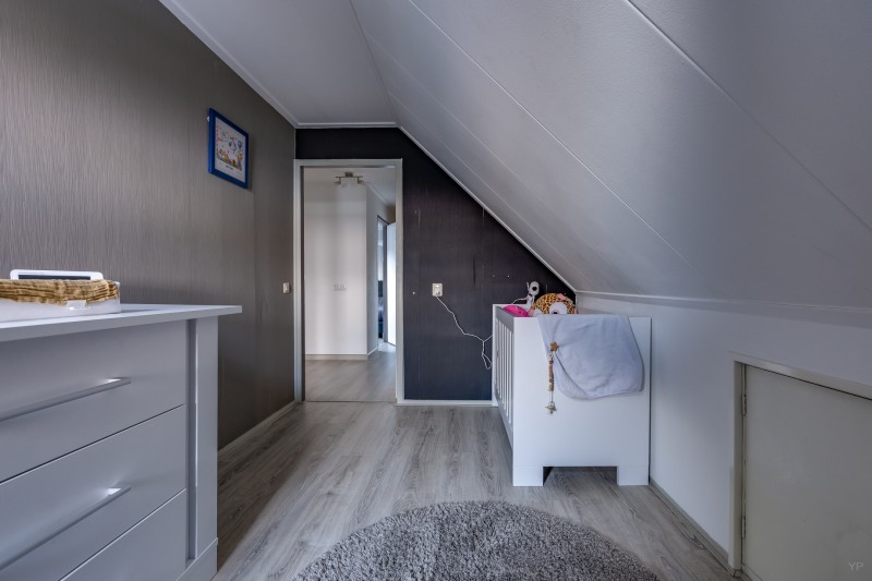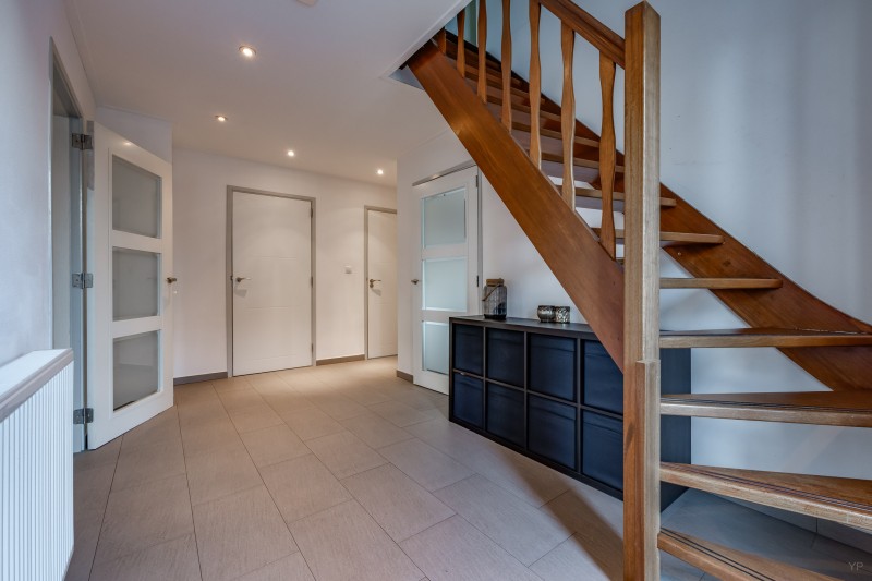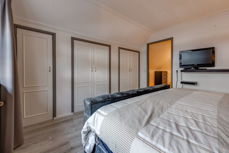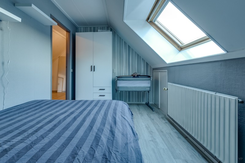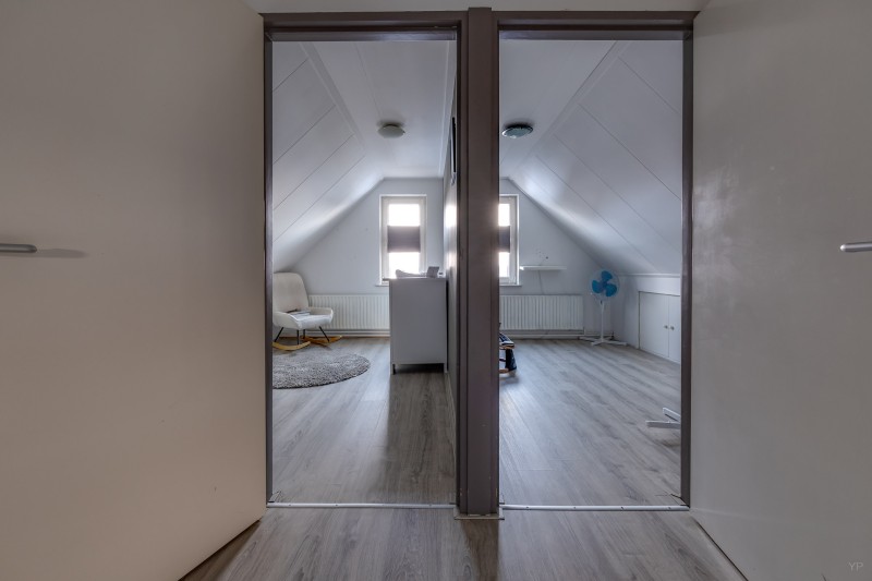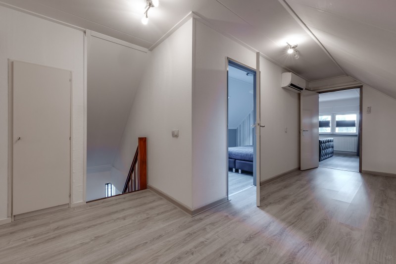 Overloop met airco, vaste kast en bergruimte; 4 slaapkamers waarvan 1 met vaste kasten en 3 met bergruimte achter de knieschotten.