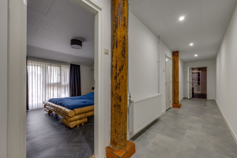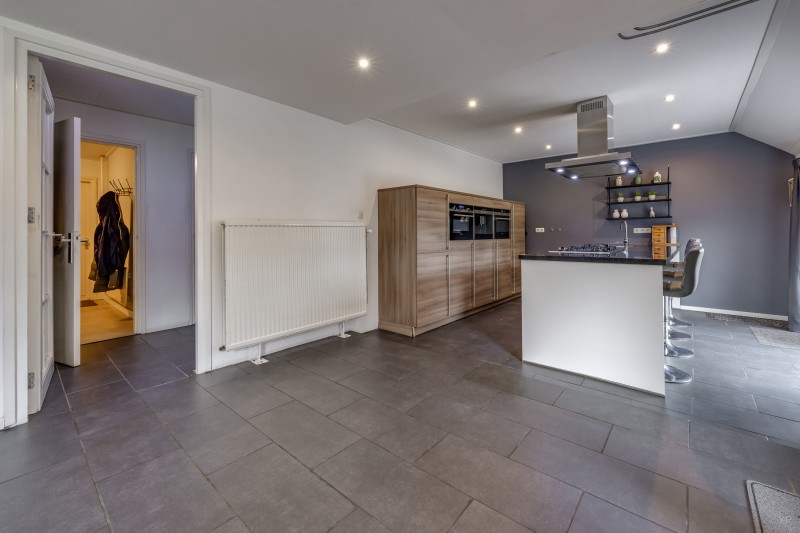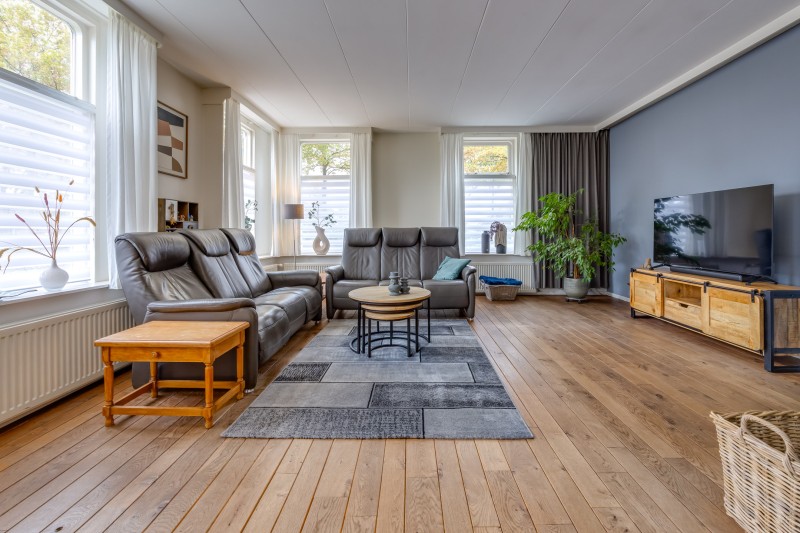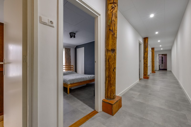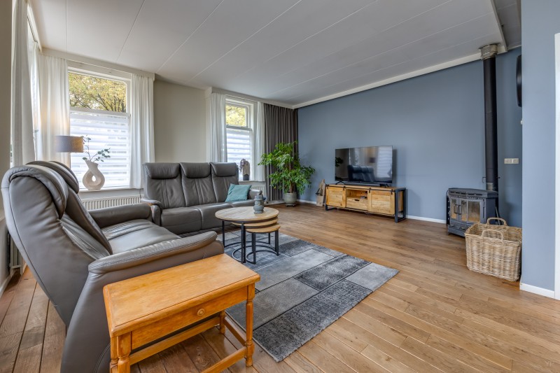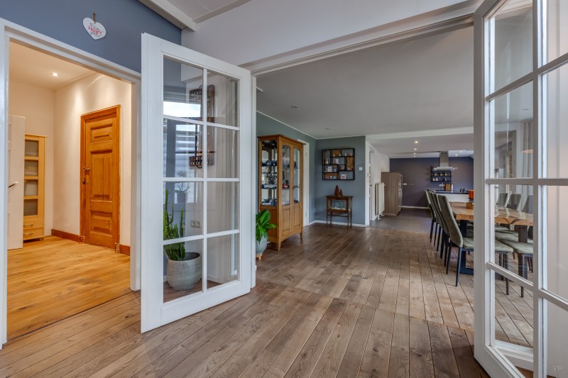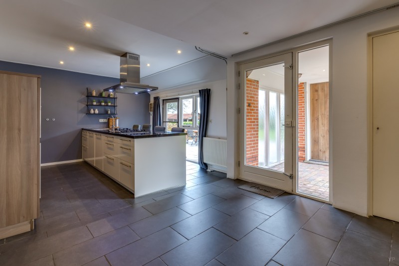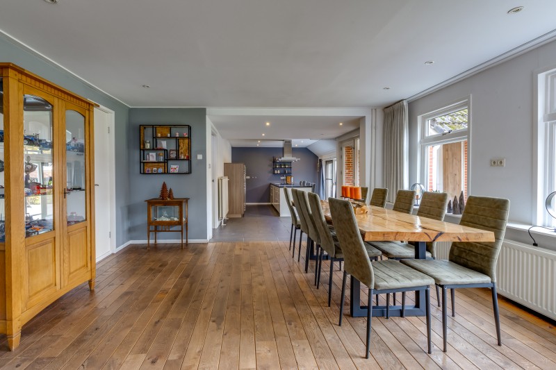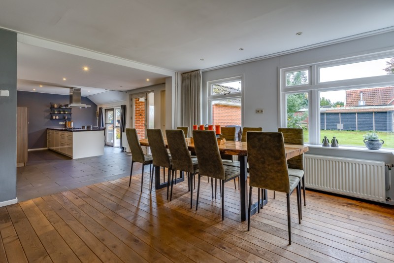 Royale woonkeuken met moderne aanbouwkeuken v.v. inbouwapparatuur en kookeiland; zijentree; eetkamer met vaste kast; ruime L vormige woonkamer v.v. massief houten vloer en houtkachel; tussenhal met toegang tot slaap-/hobbykamer (genoemd opkamer) met daaronder een ruime kelder; bijkeuken met doorgang naar de deel c.q. schuurruimte; ketelruimte; ruim modern toilet met fontein; nieuwe badkamer met douchehoek, 2e toilet, wastafelmeubel en vloerverwarming; de 3 overige slaapkamers, allen v.v. vaste kasten.