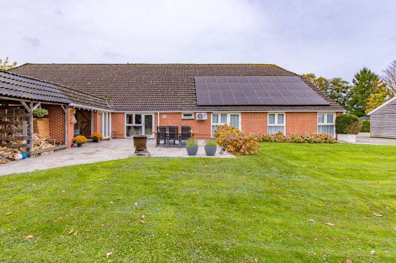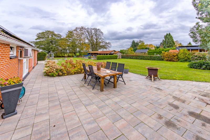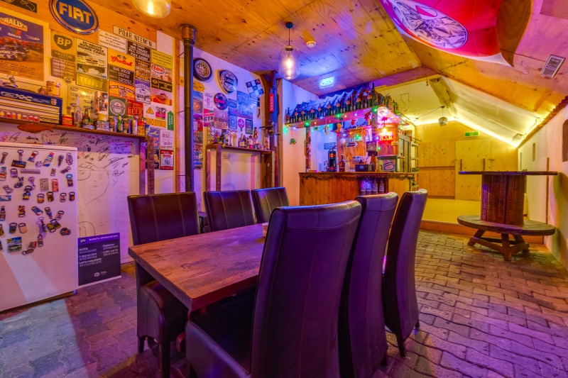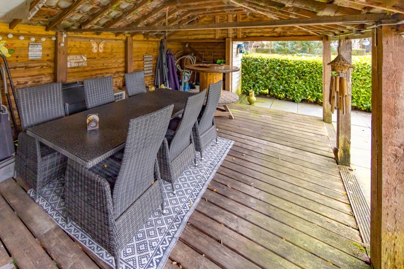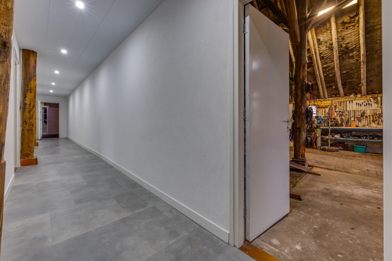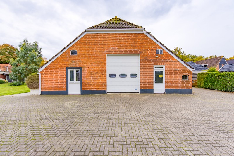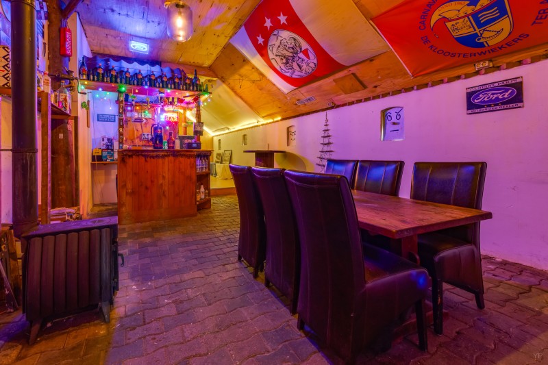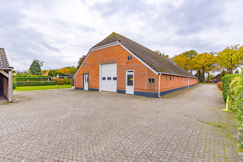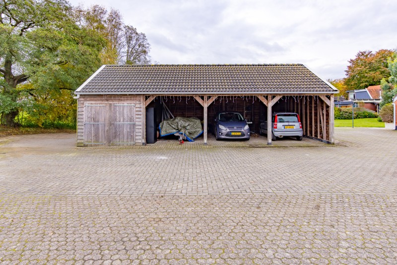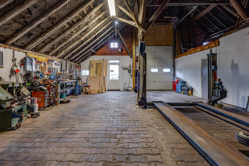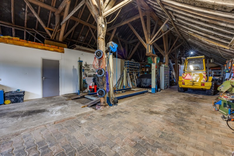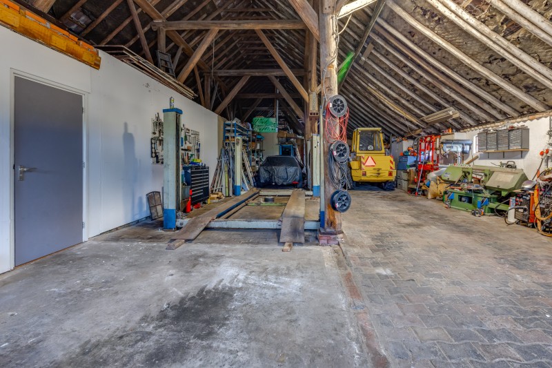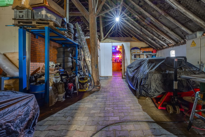 Royale schuur geschikt voor meerdere doeleinden zoals: het stallen van auto's of caravan; een gedeelte van de schuur is afgetimmerd en ingericht als ontspannings-/hobbyruimte met bar.